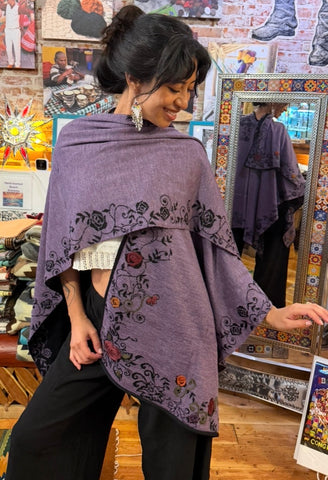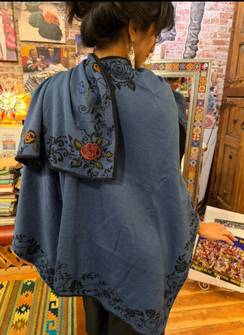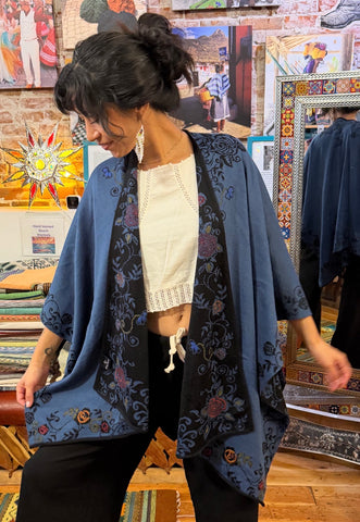 This open front cape is made with 100% Peruvian alpaca. It's reversible, so it's like two cozy sweaters in one! Hand embroidered flowers that embellish the woven design. It's elegant and charming. Wash in cold, hang dry.