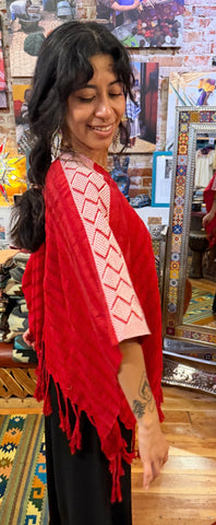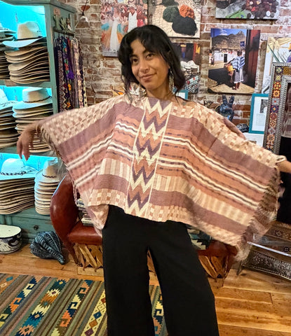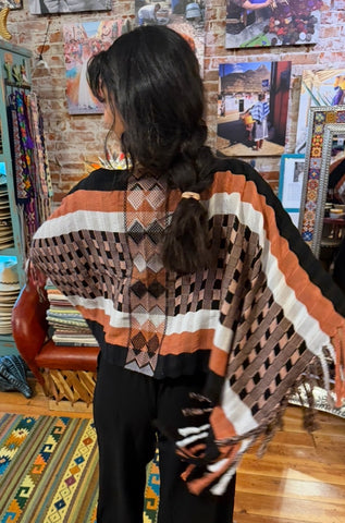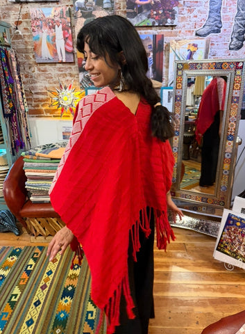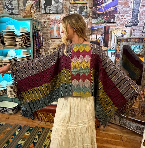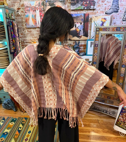 These 100% cotton, museum quality textiles are pure art. Each one is hand woven on a back strap loom from Chiapas Mexico by weavers who carry on this ancient tradition. Each elegant poncho can be worn two different ways which changes the look completely . Turn so the v neck is in front or turn sideways to or a more formal look . Each poncho is one of a kind so please email the store before ordering so we can send you pictures . We have a large selection of colors.