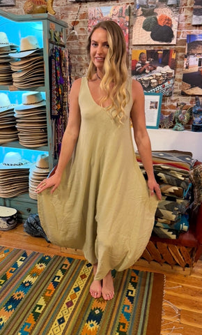 We call this fun, loose and flowing jumper the Flying Squirrel! The fit is so comfortable and cool. The “V” neck is flattering and of course the big pockets make this the ideal romper! Colors can vary depending on the stick at hand. All of our clothes are pre washed. Wash in cold, hang dry.